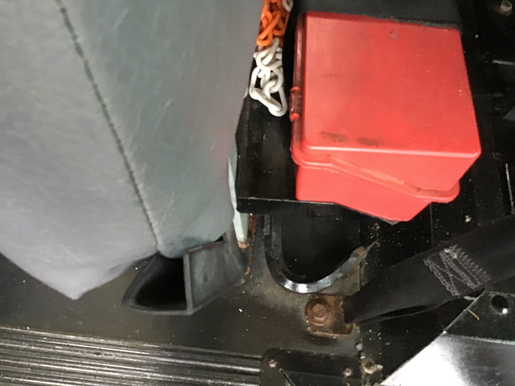 “In this red box behind the driver’s seat are three red reflective triangles. Attached to the floor below it is a pry bar. I would also inspect that the securely mounted fire extinguisher is properly charged. There are no spare fuses on board but they would be stored here if there were.”
